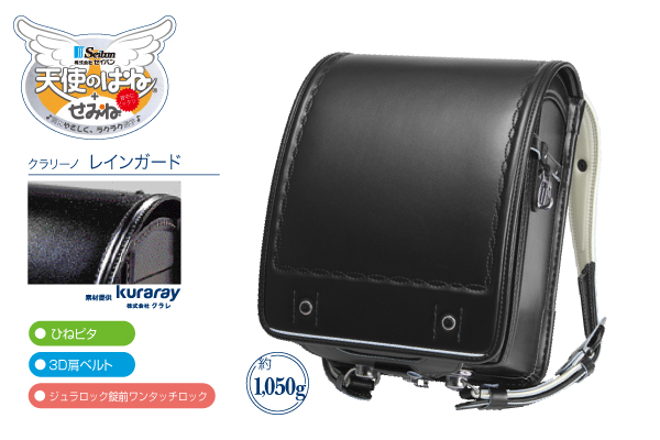 ひねピタが付いた雨に強いランドセル。主素材:クラリーノ レインガードFX 背中:チェルデー