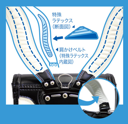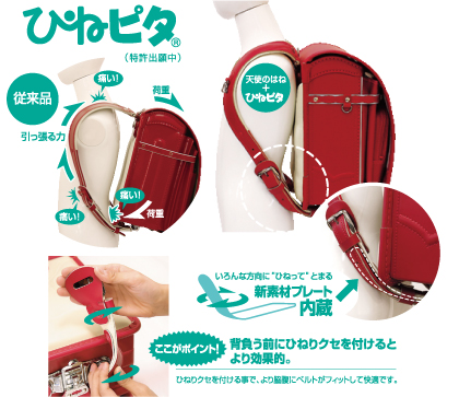 従来のランドセルは胸から脇腹にかけてベルトの「浮き」が見られ、ランドセルがズレて走ったり飛んだりした時に、ベルト留め具が脇腹に当たり痛いといったトラブルがありました。 これに対し「ひねピタ」は肩・胸・脇腹にフィットしているので、お子様と一体となり、とっさに移動してもバランスがくずれず、より安全な通学ができます。