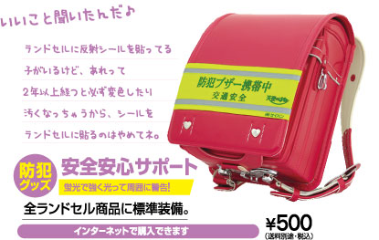 従来の警告シール等はランドセル本体に直接貼る事で、ランドセル表面が傷んでしまいますが、このサポーターはゴムで巻き固定するので、ランドセルが傷つかず安心です。 また、蛍光色で強く光を反射しますので、薄暗い下校時もハッキリとクルマのドライバーから確認できます。